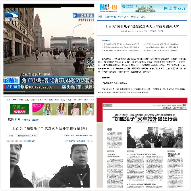 2014年以來,公司不斷接到考察客戶的投訴,稱在火車站、汽車站等地有不法分子偽裝成政府部門的工作人員,利用外地來漢客戶人生地不熟的弱點(diǎn),實(shí)施騙局,甚至敲詐,3月18日武漢本地各大媒體也以各種形式報(bào)道了此種亂像,將這類人員稱為“加盟兔子”